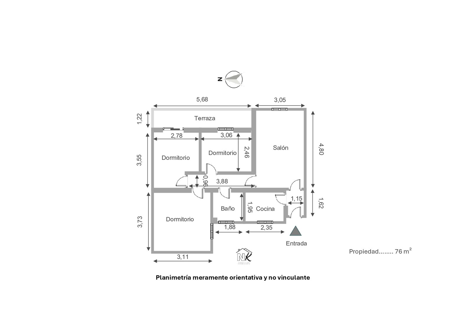 La vivienda se distribuye de la siguiente forma: Hall de entrada, cocina, salón comedor, pasillo distribuidor que nos da acceso a un baño completo con ventilación natural y los tres dormitorios, uno de ellos con acceso a la terraza.